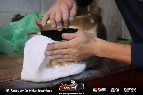Conforme se va trabajando se va viendo los pequeños detalles dándole la forma más realista posible para lograr esa expresión de asombro en el público. No se debe aplicar mucho secante ya que la masilla se nos logra secar rápido haciendo más difícil el trabajo. Los materiales deben de ser bien utilizados, cuidadosamente, evitando echar a perder la masilla. Con forme el proceso el casco va adquiriendo otra forma, adquiere más detalles, agarrando mas forma. Los cascos se realizan al pedido del cliente, con todas las personalizaciones que él quiera, dándole esa originalidad. Se debe de lijar bien para que a la hora de pintarlo quede nítido. El casco requiere de mucho trabajo.