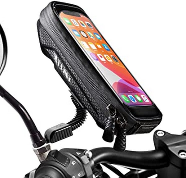 7. Soporte y funda para teléfono estos han tenido mayor popularidad para motociclistas que se manejan por la ciudad por servicios de delivery, así que este ha caído como perla, usualmente son de 6,7 pulgadas ideales para marcar ruta con el móvil de geolocalización como Google Maps y Waze.
