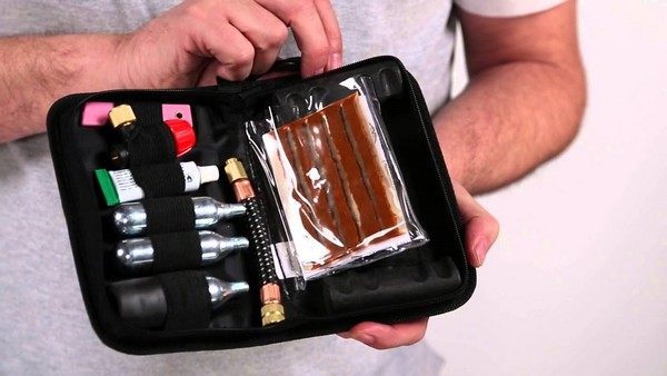6. Kit de reparación de neumáticos este kit nos servirá para cuando surja una emergencia y suceda ese pinchazo inesperado en uno de nuestros neumáticos, incluye; bomba CO2, racor con válvula, tubo flexible, cutter, kit de parches, tubo de pegamento sellador y algunos utensilios específicos.
