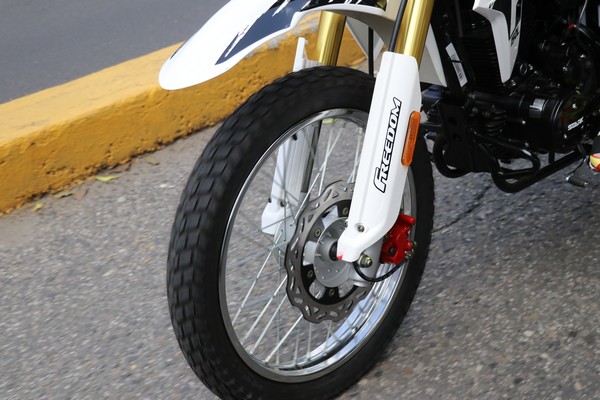 Y otras de las características de esta motocicleta es que ya cuenta con llantas para su uso urbano dando 70% de asfalto y un 30% de terracería. Ahora con los aros: cuenta con el delantero de rin 19 y trasero con rin 17 ambos de rayos.